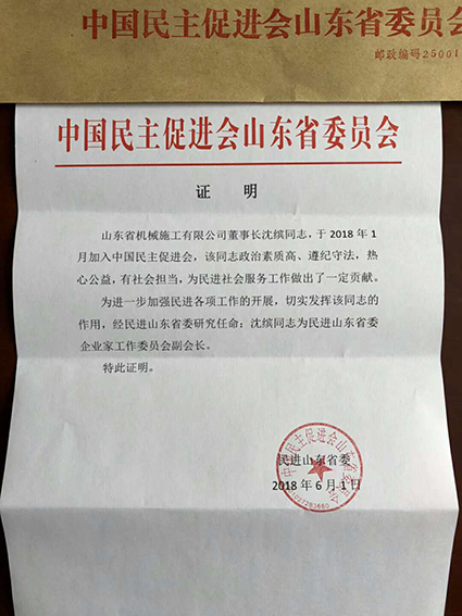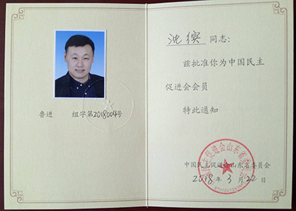 公司董事長沈繽同志于20181申請加入中國民主促進(jìn)會3月份中國民主促進(jìn)會山東省委員會正式批準(zhǔn)沈繽同志加入中國民主促進(jìn)會。