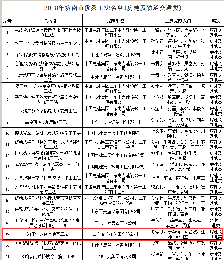 《2018年濟(jì)南市優(yōu)秀工法》名單出爐,山東機施與多家“中”字頭國企并駕齊驅(qū),更是基礎(chǔ)建設(shè)行業(yè)中唯一上榜企業(yè)。