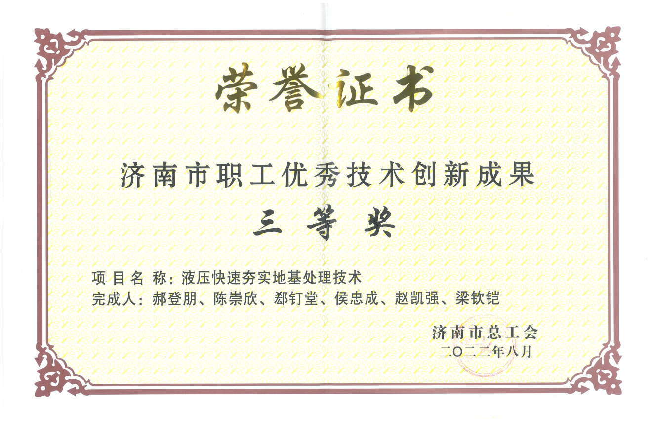 該技術(shù)先后被評(píng)為“山東省省級(jí)工程建設(shè)工法”、“山東土木建筑學(xué)會(huì)團(tuán)體標(biāo)準(zhǔn)”,2022年8月被濟(jì)南市總工會(huì)評(píng)為“濟(jì)南市職工優(yōu)秀技術(shù)創(chuàng)新成果三等獎(jiǎng)”,同年12月參加山東省職工創(chuàng)新創(chuàng)效競(jìng)賽省級(jí)決賽榮獲二等獎(jiǎng),獲山東省總工會(huì)獎(jiǎng)勵(lì)10萬元。