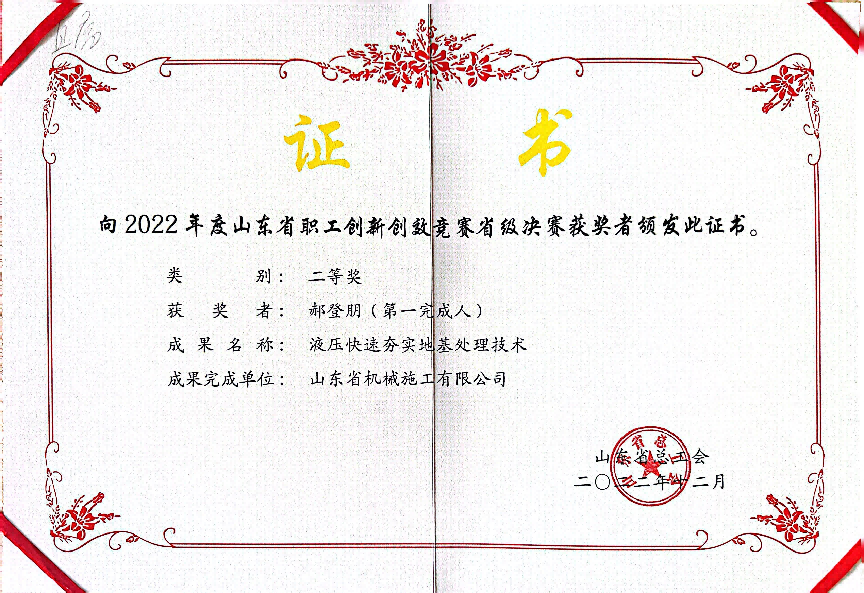 近日,山東省機(jī)械施工有限公司的創(chuàng)新技術(shù)《液壓快速夯實(shí)地基處理技術(shù)》被濟(jì)南市總工會(huì)直屬工會(huì)推薦為“全省職工優(yōu)秀創(chuàng)新成果入庫孵化轉(zhuǎn)化集中行動(dòng)”入庫項(xiàng)目。